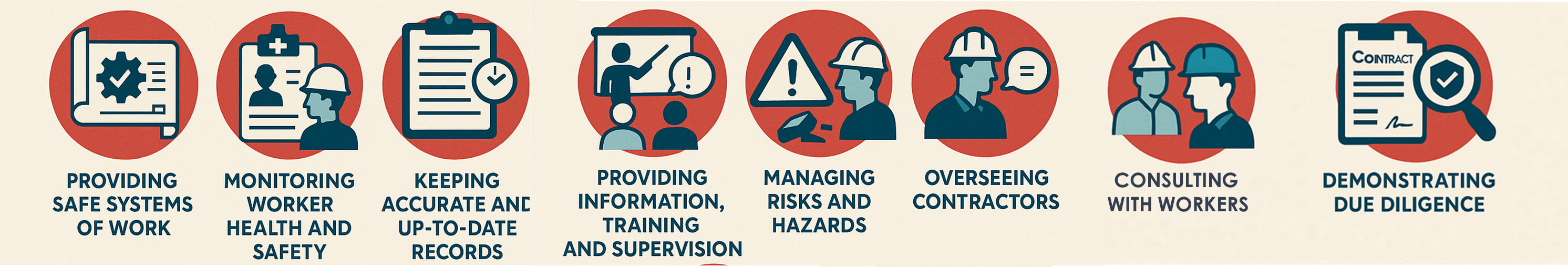These obligations require organisations to maintain accurate records, demonstrate effective management of risks, provide training, consult with workers, and ensure that contractors operate to the same safety standards.
