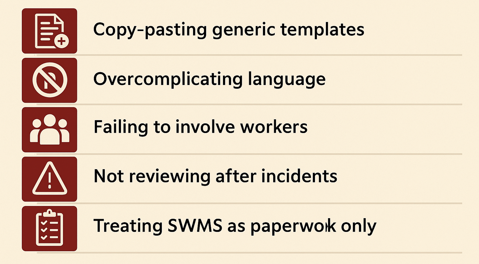 Before writing any SWMS, organisations must first identify the hazards involved. Common risks include: